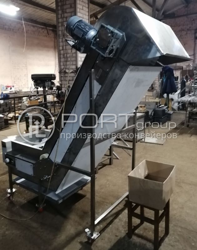 Конвейер передвижной, выполнен полностью из нержавеющей стали, лента и другие движущиеся узлы закрыты защитными кожухами, оснащен поддоном для сбора крошки. Лента полиуретановая, пищевая, с поперечными захватами и гофробортами высотой 50 мм. Угол наклона 57 градусов. Более подробно с проектом можно ознакомиться здесь: